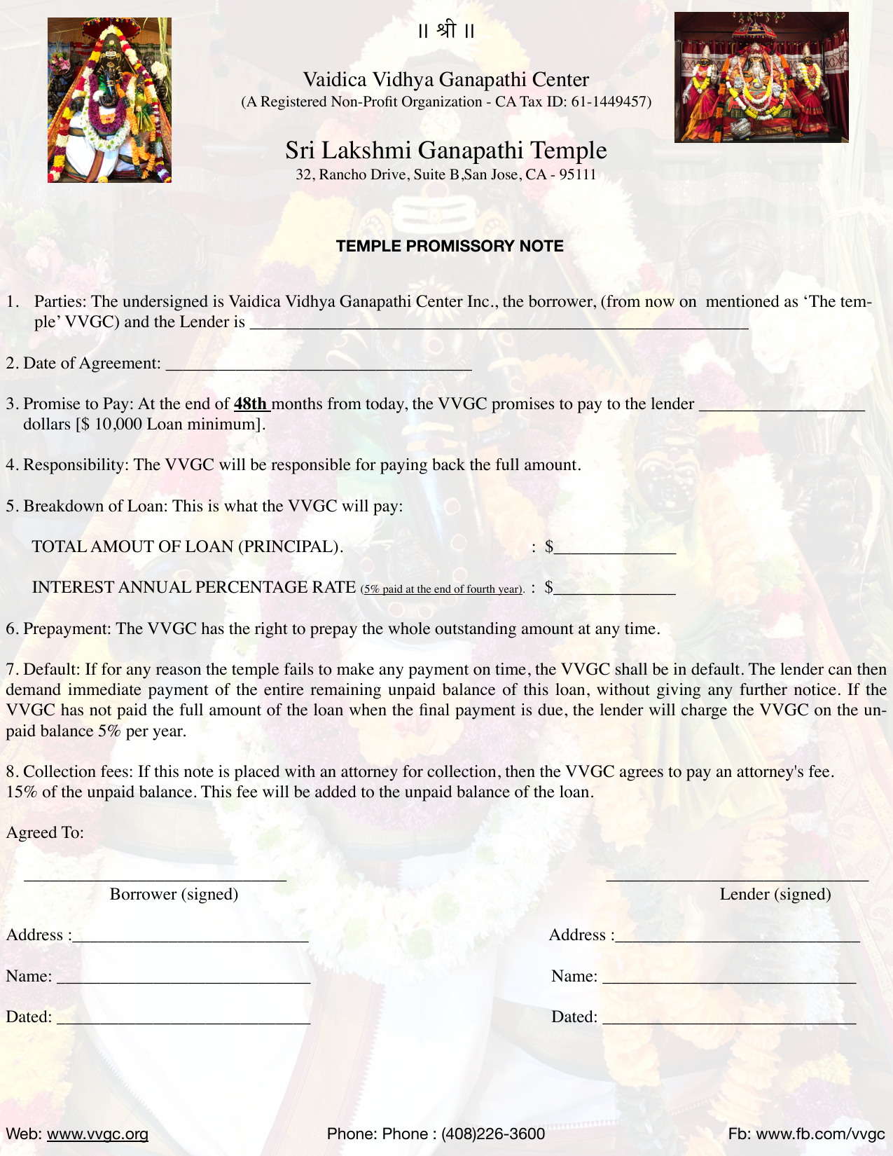 If you would like to extend a loan to VVGC, you do so for a minimum of $10,000 on a 4 year term or more. VVGC will pay a 5% interest rate at the end of the term. Click here for the Temple promissory note. Please call the Temple for any qustions about this loan program.