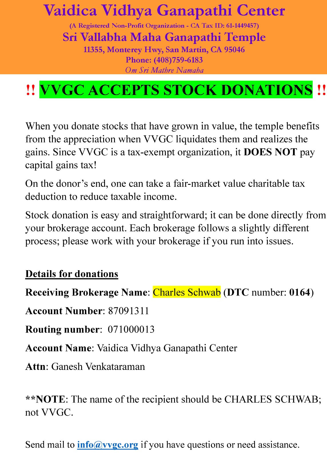 You can save on your capital gains tax by directly donating your appreciated stock rather than cash. Brokerages such as Schwab provide facility for stock donations via their charities arm. Use the VVGC Tax ID 61-1449457 to direct the donation to the temple.